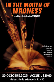 Pour la 3ème édition des séances Halloween Classic's, le collectif CINÉTIQUE souhaite célébrer les 30 ans de la sortie cinéma du fantasque ‘’IN THE MOUTH OF MADNESS’’. Oeuvre fascinante qu’est le 13ème film de John Carpenter, un des maîtres incontestés de l’Horreur.